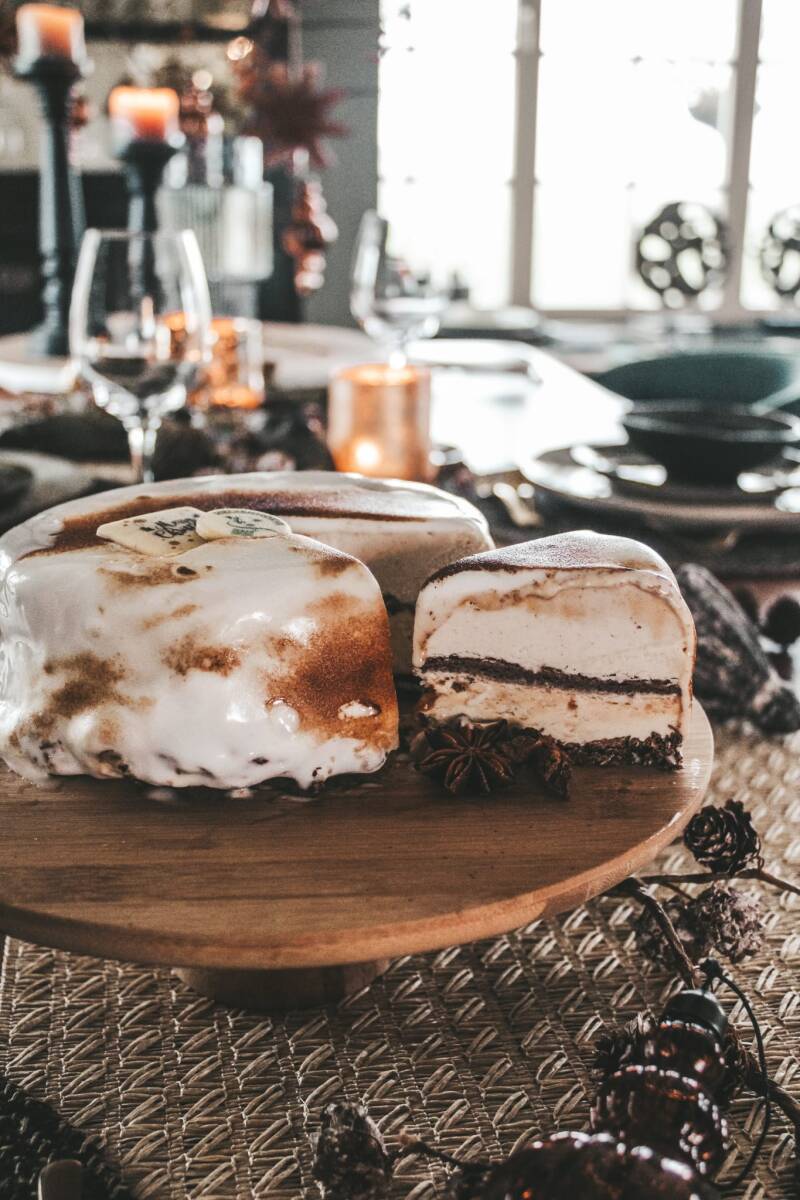Feestelijke ijstaart met romig Zeeuwse babbelaar- en Zeeuwse bolusijs met daartussen een verfijnde laag chocoladesemelcuit op een krokante chocoladebodem. Afgewerkt met een luchtige, licht afgebrande meringue.